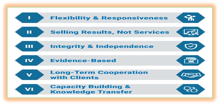 We have a consulting model that creates practical solutions and builds capabilities at the same time. Although every client and engagement is different, the following basic values and approaches guide our service delivery. When serving our clients, we rely on our core values, the key of which include: